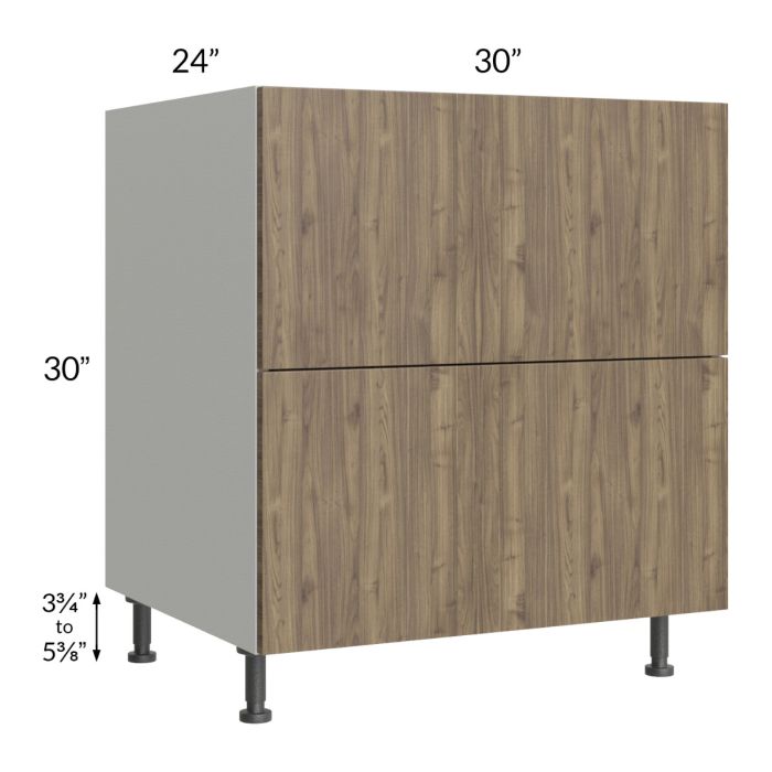 2 drawer base cabinet. Each drawer front measures 14-7/8" high. Black, adjustable, plastic furniture feet will also be included which will add 3-3/4" to 5-3/8" to the 30" height.