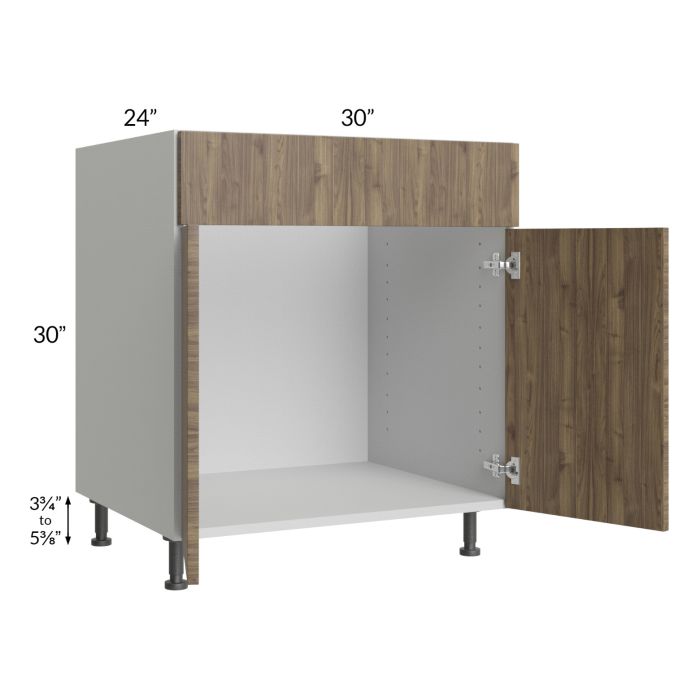 Sink base cabinet with 2 doors and (1) 6-3/4" false drawer front. This cabinet will have no shelves (the sides will come pre-drilled with shelf clip holes if loose shelves are needed - which need to be purchased separately). Black, adjustable, plastic furniture feet will also be included which will add 3-3/4" to 5-3/8" to the 30" height.