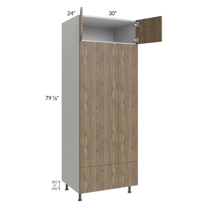 Double oven cabinet with two 11-7/8" high doors on top and one 11-7/16" high drawer on bottom (height is drawer front height). The oven cabinet has a full panel that will need to be cut on site, the maximum cutout is 28"W x 55"H. When using two appliances, it is recommended to provide support for the top appliance; PLY-3/4 can be used and would need to be purchased separately, and then installed on site. Black, adjustable, plastic furniture feet will also be included which will add 3-3/4" to 5-3/8" to the 79-1/2" height.