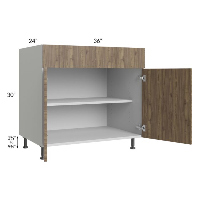 2 door base cabinet with (1) 18" deep adjustable shelves and 1 drawer. Black, adjustable, plastic furniture feet will also be included which will add 3-3/4" to 5-3/8" to the 30" height.