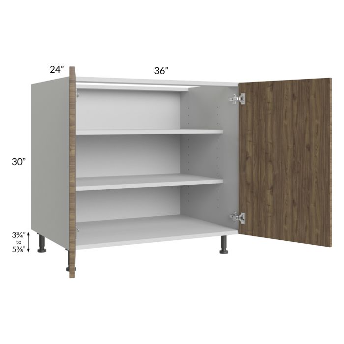 2 full height door base cabinet with (2) 18" deep adjustable shelves. Black, adjustable, plastic furniture feet will also be included which will add 3-3/4" to 5-3/8" to the 30" height. Please note that the shelves will not be included if roll outs are added to the cabinet.
