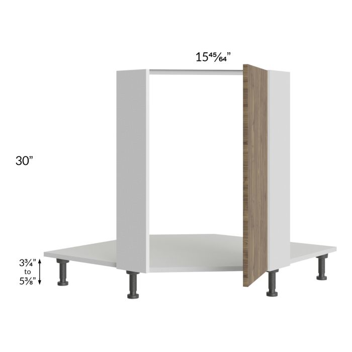 Full height door diagonal corner sink front that will take up 36" of wall space from the corner out, on each wall, once installed. The door width is 15-45/64" and it uses 45-degree hinges with Blumotion soft close. It will include the sink front floor as well as four black, adjustable, plastic furniture feet will also be included which will add 3-3/4" to 5-3/8" to the 30" height. No shelves will be included.