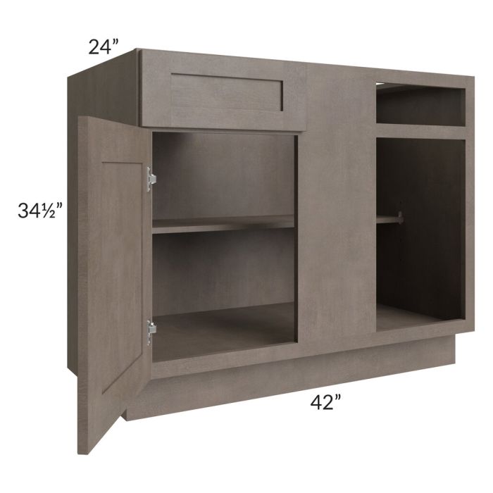 1 door blind base corner cabinet. The actual width is 42" however it will take up a minimum of 45" of wall space and can be pulled up to 48". This cabinet has 1 drawer and is reversible. The door/drawer width is 17-1/2”, blind opening is 14 7/8”. The drawer and door opening will be 3" less than the width of the door and drawer front. A filler will be needed between the blind and adjacent cabinet to ensure the drawer and door open properly; the filler must be purchased separately.