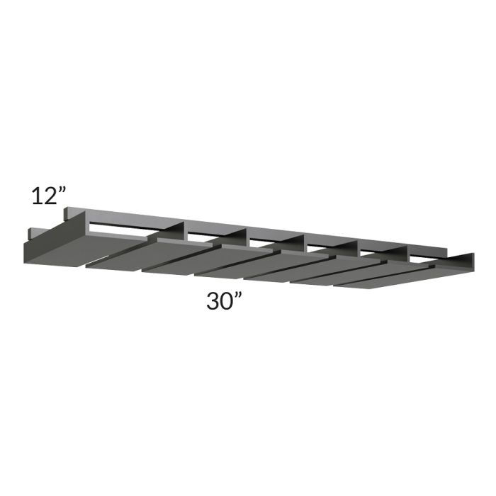 Stem glass holder that is made of solid wood and mounts to the bottom of a wall cabinet and can be cut to fit smaller cabinets. It will hold 6 rows of glasses (if full 30" width is used). Once installed, it hangs down 1-3/4". This product ships pre-assembled.