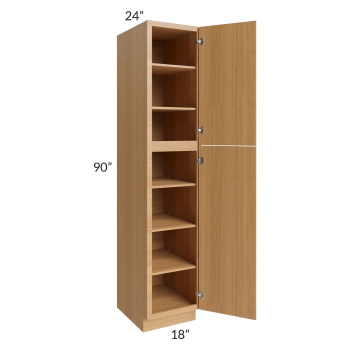 Wall pantry cabinet with 2 doors, 1 smaller door on top and 1 larger door on bottom. This pantry cabinet comes with 1 fixed shelf and 5 adjustable shelves. Measurements are as follows: Top/Middle/Bottom door width = 17 9/16". Top door height = 35 5/16". Middle/Bottom door height = 49 1/4".