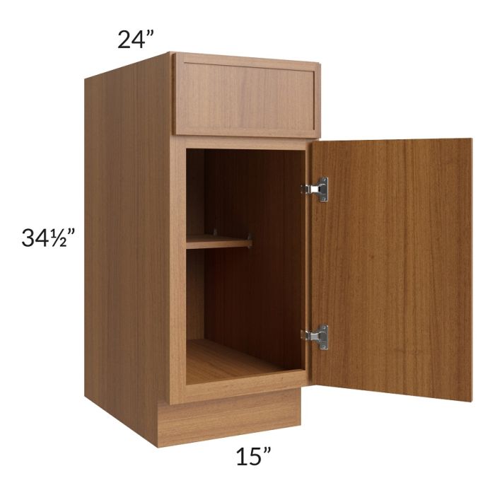 1 door base cabinet with 1 drawer and 1 shelf. Looking for a trash pullout for this cabinet? Find one here: https://www.thertastore.com/countertops-and-accessories/inside-cabinet-accessories/bottom-mount-single-pullout-waste-container-fits-an-15-wide-base-cabinet.html.