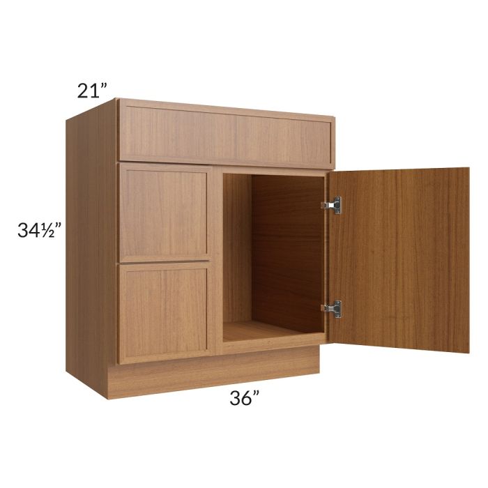 Bathroom vanity that has 1 door on the right, 1 fake drawer front on top, and 2 drawers on the left.