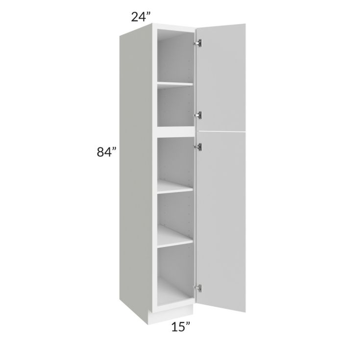 Wall pantry cabinet with 2 doors, 1 smaller door on top and 1 larger door on bottom. This pantry cabinet comes with 1 fixed shelf and 3 adjustable shelves. Measurements are as follows: Top/Middle/Bottom door width = 14 1/2". Top door height = 29 5/16". Middle/Bottom door height = 49 1/4".