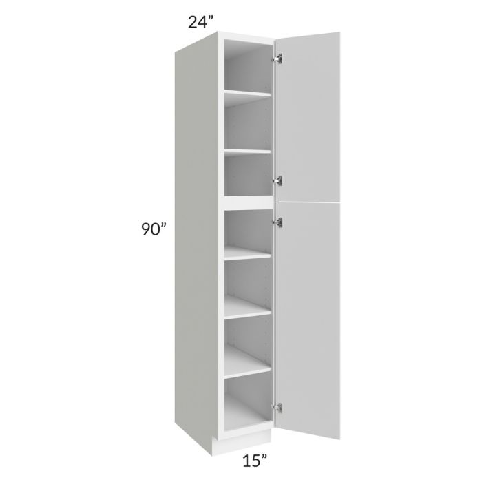 Wall pantry cabinet with 2 doors, 1 smaller door on top and 1 larger door on bottom. This pantry cabinet comes with 1 fixed shelf and 5 adjustable shelves. Measurements are as follows: Top/Middle/Bottom door width is 14-1/2". Top door height is 35-5/16". Middle/Bottom door height is 49-1/4".