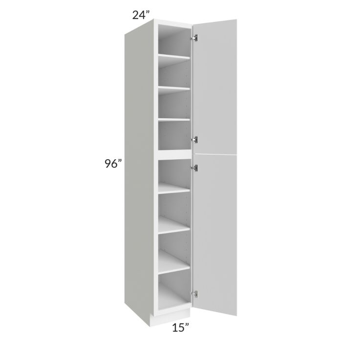 Wall pantry cabinet with 2 doors, 1 smaller door on top and 1 larger door on bottom. This pantry cabinet comes with 1 fixed shelf and 6 adjustable shelves. Measurements are as follows: Top/Middle/Bottom door width is 14-1/2". Top door height is 4-5/16". Middle/Bottom door height is 49-1/4".