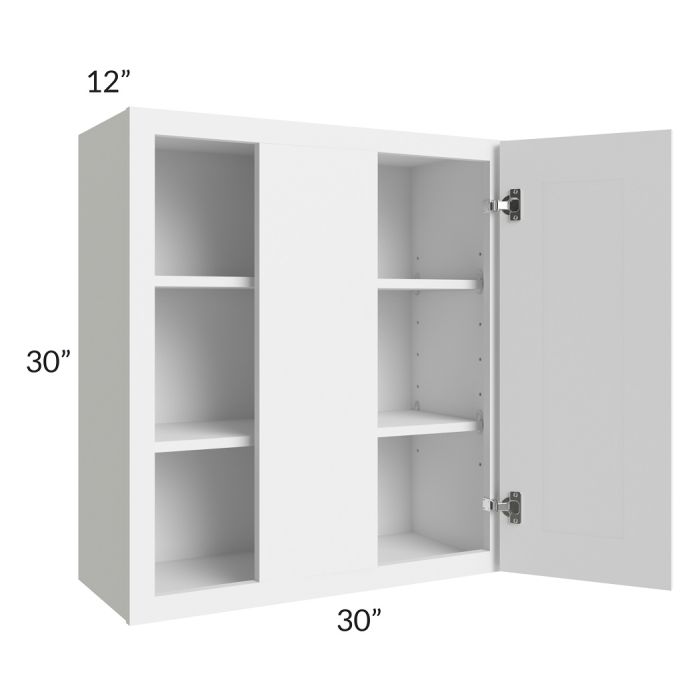 Wall blind corner cabinet with a max pull of 3" from the corner, meaning it will take up anywhere between 30" and 33" of wall space. The cabinet has 2 shelves and 1 door that is approximately 14" wide.