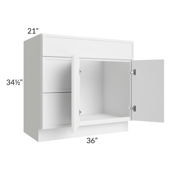 Bathroom vanity that has 2 doors on the right, 1 fake drawer front on top, and 2 drawer on the left.