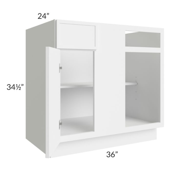 1 door blind base corner cabinet. The actual width is 36" however it will take up a minimum of 39" of wall space and can be pulled up to 42". This cabinet has 1 drawer and is reversible. The door/drawer width is 11-9/16, blind opening is 8-7/8. The drawer and door opening will be 3" less than the width of the door and drawer front. A filler will be needed between the blind and adjacent cabinet to ensure the drawer and door open properly; the filler must be purchased separately.