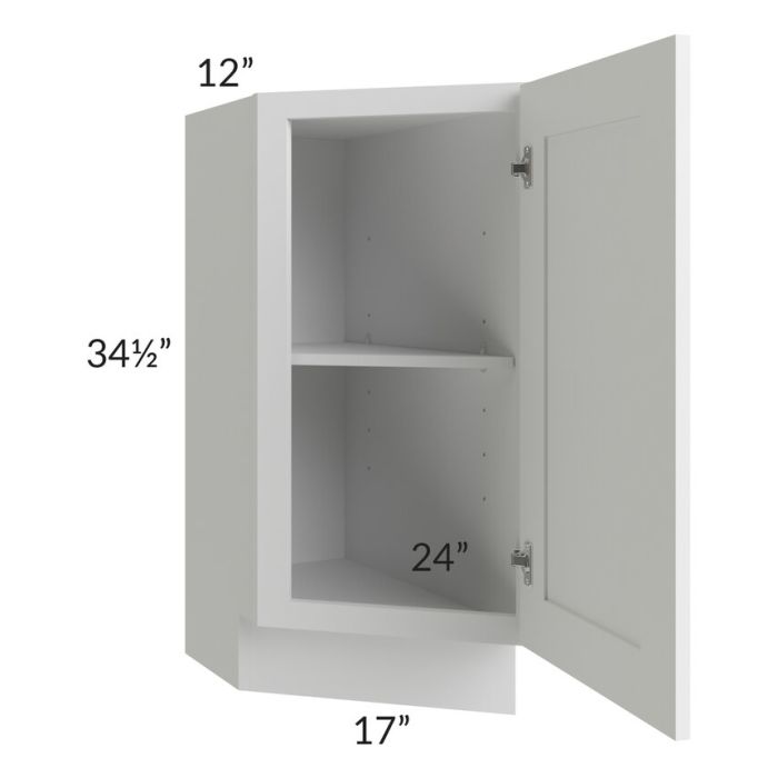Full height door cabinet that is meant to be used at the end of a cabinet run. It will have a 24" deep side on the right which gets installed against the adjacent cabinet. The door is angled and the exposed side of the cabinet (on the left) will be 12" deep.
