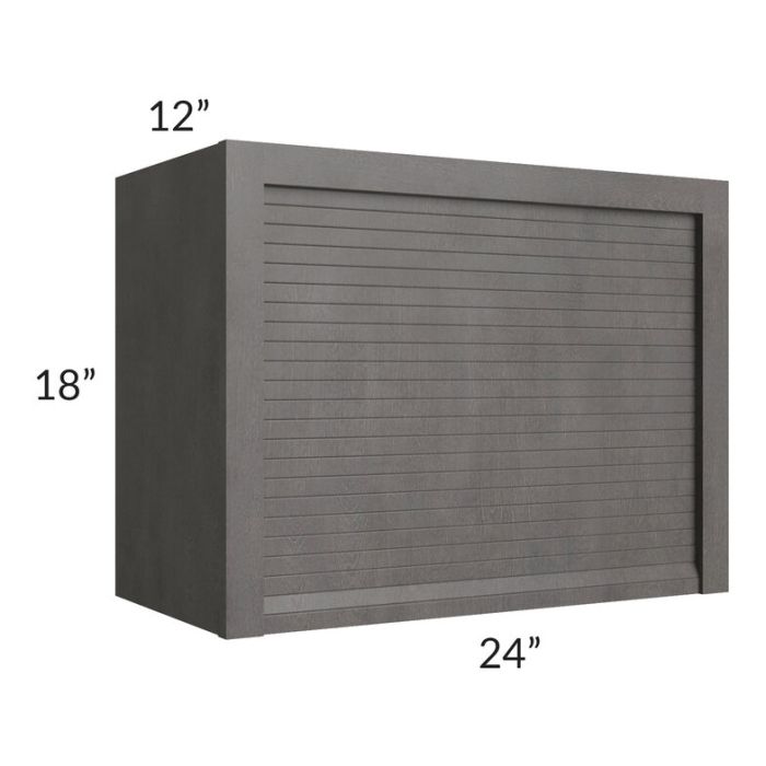 Appliance garage with a roll up, tambour door and is designed to fit under a 24" wide wall cabinet.