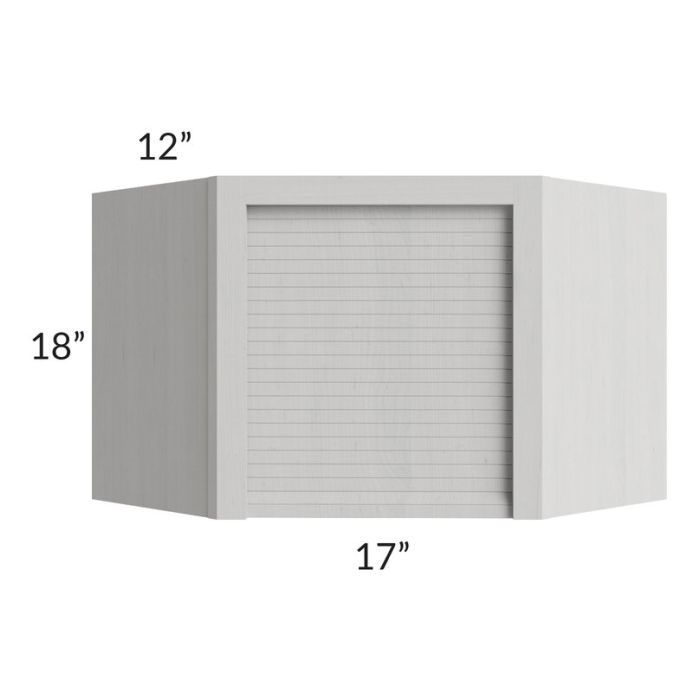 Appliance garage with a front width of 17". It will have a roll up, tambour door and is designed to fit under a 24x24 diagonal corner wall cabinet. The door opening is approximately 14" wide, the tambour door is partially inserted into the frame on either side.