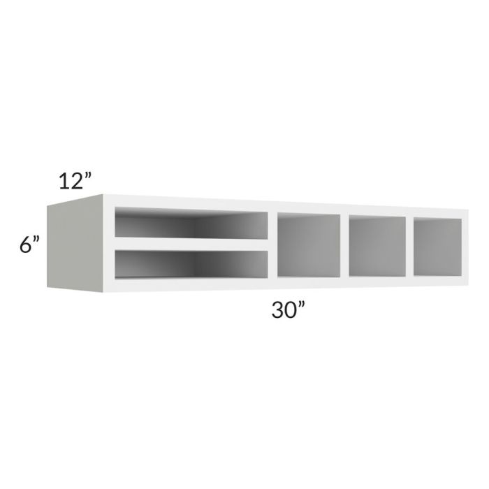 Organizer cabinet with wood veneer edge banding and a finished interior. There will be 2 horizontal shelving areas on the left which measure approximately 11-1/8"W x 2"H, and 3 vertical storage areas on the right which measure approximately 5-1/4"W x 4-3/4"H.