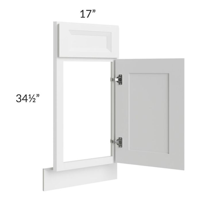 Diagonal corner sink front that will take up 36" of wall space from the corner out, on each wall, once installed. The door width is 14-1/2" and the face frame width is 17". This cabinet will have a partial overlay door to ensure it opens without hitting the adjacent cabinet, so there will be about 1-1/8" of face frame, visible on either side of the door. The corner sink front floor must be ordered separately (SKU DSFL36).