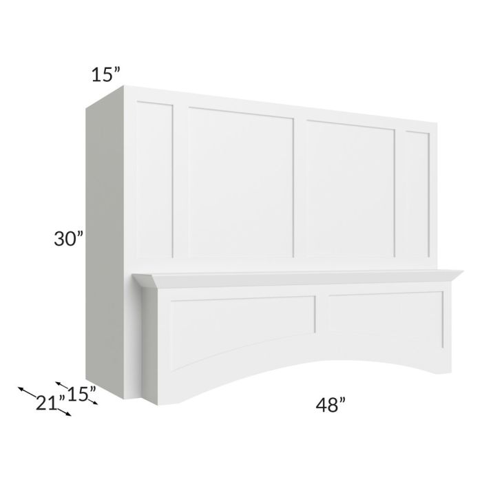 Arched wood hood with an overall depth of 21", the depth of the main part of the hood (which goes against the wall) is 15". The top panel will lift up and the sides will be flush. If crown is being installed, it would be installed above the cabinet, not on the face frame. A full interior stainless steel hood liner will also be installed (liner can be removed on site, if needed, however a hood liner is strongly recommended to prevent the wood hood from getting burned and is required by code in many places. The interior hood liner dimensions are as follows: