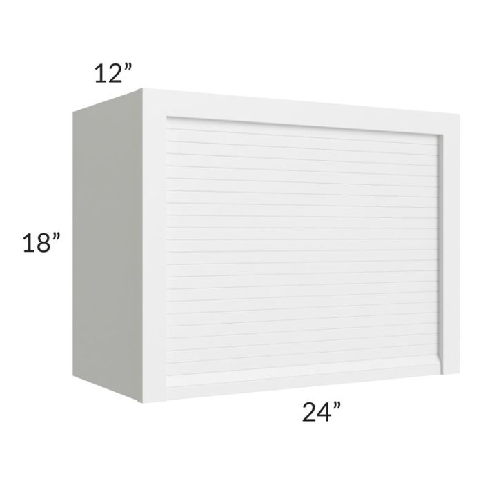 Appliance garage with a roll up, tambour door and is designed to fit under a 24" wide wall cabinet.