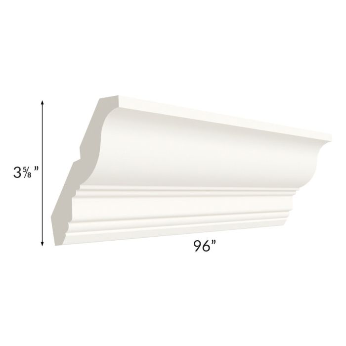 Crown molding that comes in an 8 foot strip. Commonly used to finish the top of wall cabinets. Once installed, the crown will stick out abut 2-27/32" from the cabinet and the height off the cabinet will be about 3-5/8".