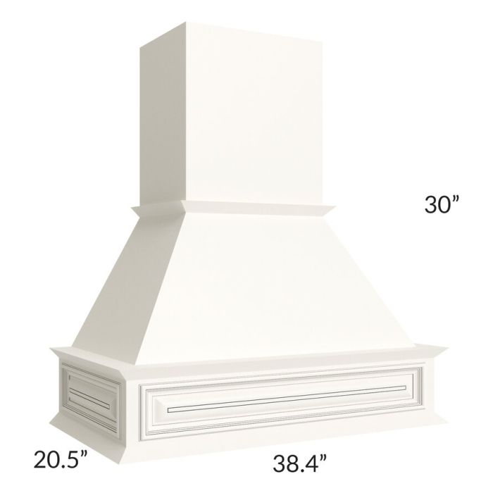 Wood range hood with no decorative rail. The top 30" is trim-able if needed. The hood is 38-3/8" at widest point of base. This is for an actual hood, not a hood cover and a separate liner and blower will be needed.