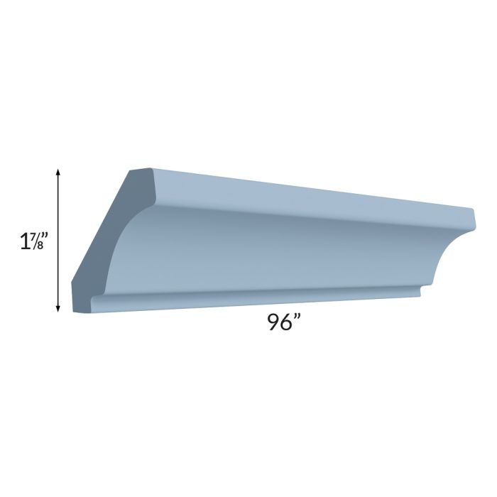 Crown molding that comes in an 8 foot strip. Commonly used to finish the top of wall cabinets. Once installed, the crown will stick out about 1-5/8" from the cabinet and the height off the cabinet will be about 1-7/8".