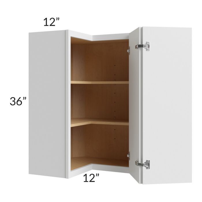 Wall diagonal corner cabinet that takes up 24" from the corner out, on each wall. This cabinet comes with 2 adjustable shelves.