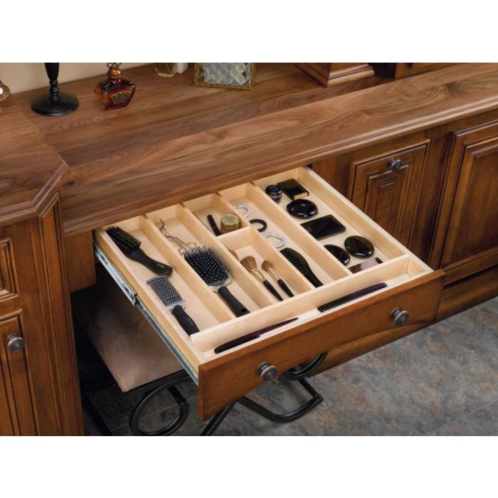 Organize kitchen drawers with this Wood Utility Tray Insert made of classic maple hardwood with a UV-cured clear finish to ensure an acceptable match to any kitchen cabinet. This modern day storage solution requires a simple drop-in installation that may be trimmed to fit various drawer sizes between 15"-27" wide.