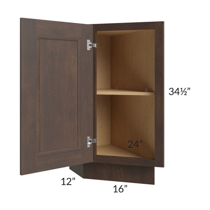 Full height door cabinet that is meant to be used at the end of a cabinet run. It will have a 24" deep side on the right which gets installed against the adjacent cabinet. The door is 16" wide and angled. The exposed side of the cabinet (on the left) will be 12" deep. The door will always be hinged on the 12" deep side.