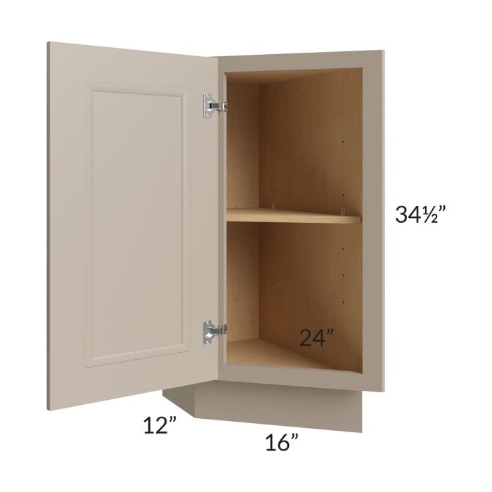 Full height door cabinet that is meant to be used at the end of a cabinet run. It will have a 24" deep side on the right which gets installed against the adjacent cabinet. The door is 16" wide and angled. The exposed side of the cabinet (on the left) will be 12" deep. The door will always be hinged on the 12" deep side.