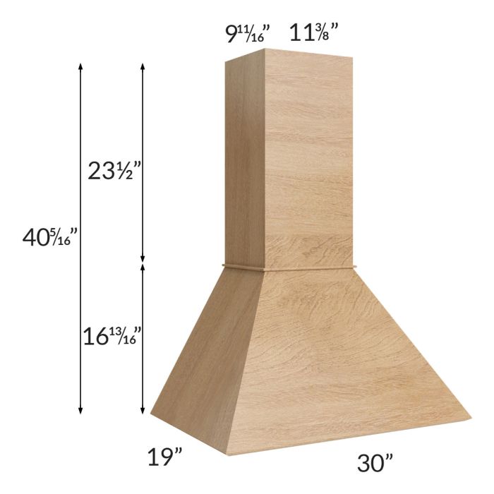 Euro style wood hood that comes with a stainless steel liner. The chimney height of 23-1/2" can be trimmed on site, if needed. Blower is not included and would need to be purchased separately. The chimney depth is 9-11/16" and the width is 11-3/8".