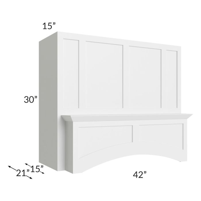 Arched wood hood with an overall depth of 21", the depth of the main part of the hood (which goes against the wall) is 15". The top panel will lift up and the sides will be flush. If crown is being installed, it would be installed above the cabinet, not on the face frame. A full interior stainless steel hood liner will also be installed (liner can be removed on site, if needed, however a hood liner is strongly recommended to prevent the wood hood from getting burned and is required by code in many places. The interior hood liner dimensions are as follows: