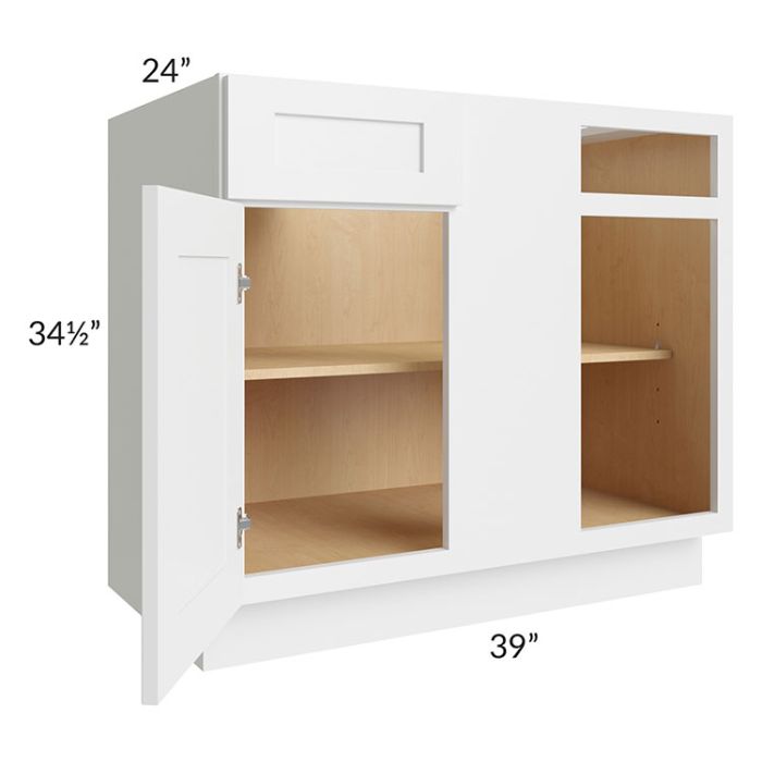 1 door blind base corner cabinet. The actual width is 39" however it will take up a minimum of 42" of wall space and can be pulled up to 45". This cabinet has 1 drawer and is reversible. The door/drawer width is 14-9/16”, blind opening is 11 7/8”. The drawer and door opening will be 3" less than the width of the door and drawer front. A filler will be needed between the blind and adjacent cabinet to ensure the drawer and door open properly; the filler must be purchased separately.
