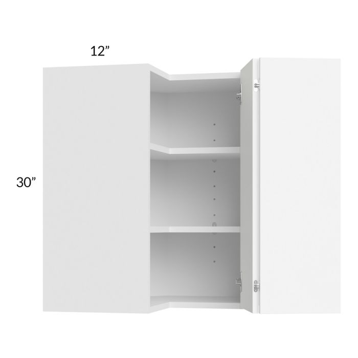 Easy reach corner wall cabinet with 2 shelves and a bi-fold door.