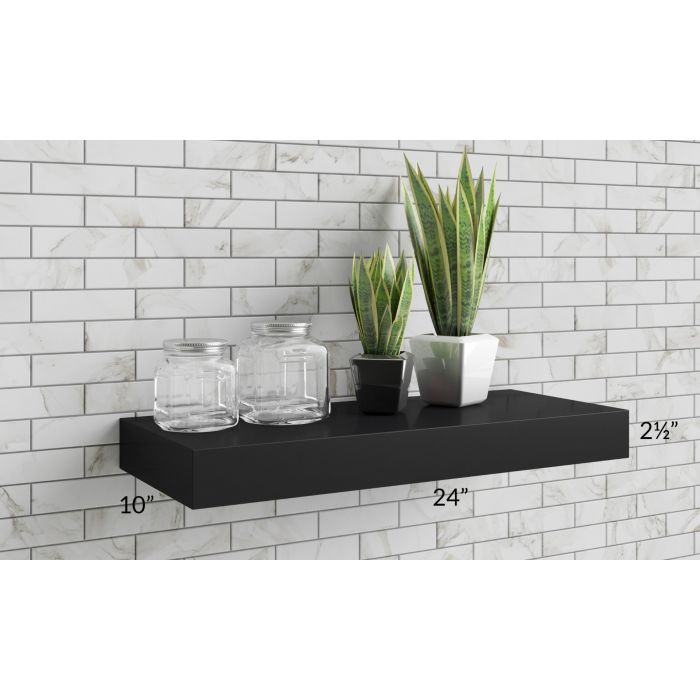 Width 24" | Height 2.5" | Depth 10"Floating shelf that will include the mounting brackets and hardware. The weight limit is 15 lbs/linear foot as long as the proper installation instructions are followed (instructions will be included with the shelf).