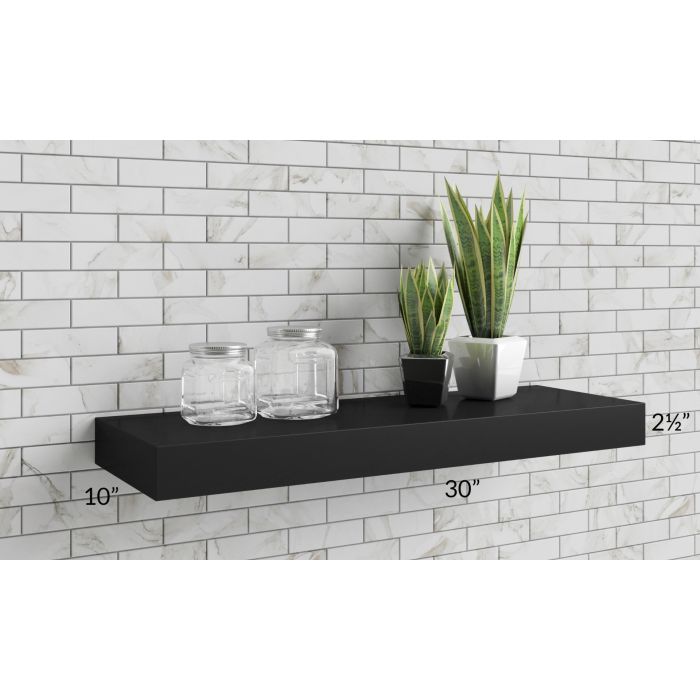 Width 30" | Height 2.5" | Depth 10"Floating shelf that will include the mounting brackets and hardware. The weight limit is 15 lbs/linear foot as long as the proper installation instructions are followed (instructions will be included with the shelf).