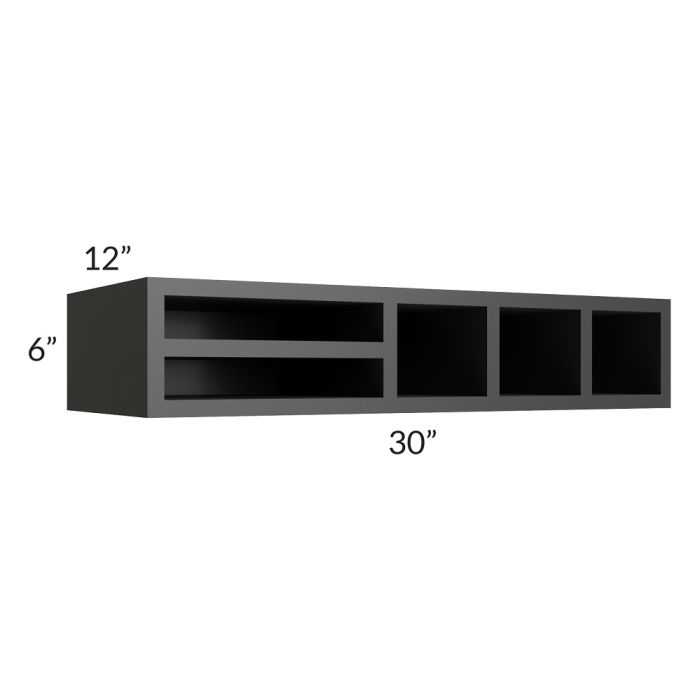 Organizer cabinet with wood veneer edge banding and a finished interior. There will be 2 horizontal shelving areas on the left which measure approximately 11-1/8"W x 2"H, and 3 vertical storage areas on the right which measure approximately 5-1/4"W x 4-3/4"H.