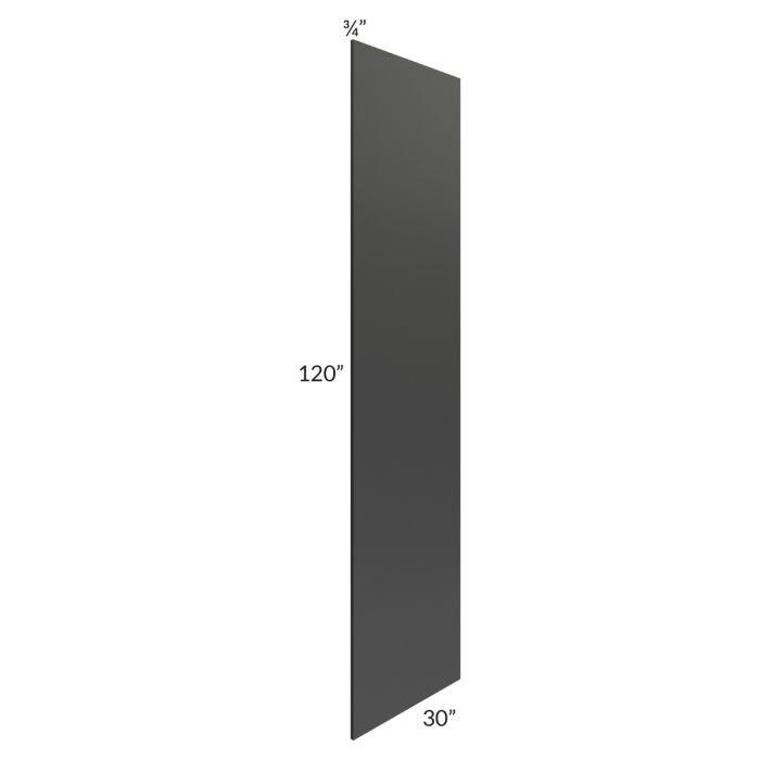 Oversized refrigerator end panel with an increased height that provides seamless coverage for stacked cabinets.