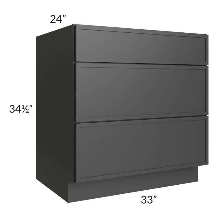 3 drawer base cabinet. Top drawer front is 6-3/4" high, middle and bottom drawer fronts are 11-1/4" high.