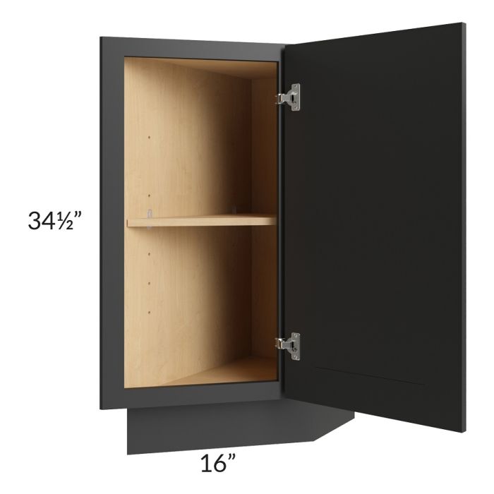 Full height door cabinet that is meant to be used at the end of a cabinet run. It will have a 24" deep side on the left which gets installed against the adjacent cabinet. The door is 16" wide and angled. The exposed side of the cabinet (on the right) will be 12" deep.