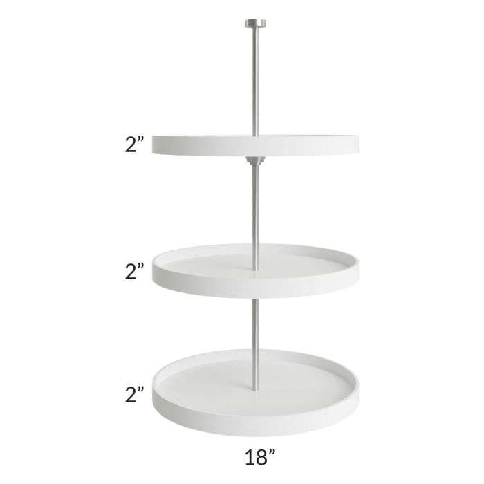 Lazy susan accessory for a 24x36 or 24x42 diagonal wall cabinet. It will have an adjustable metal post and three 18" plastic trays. Trays will be 2" high. ***Please specify which cabinet to install this item in under the order comments when checking out or it will ship loose.***