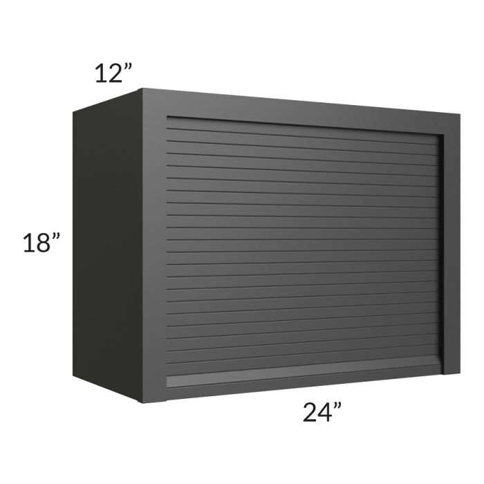 Appliance garage with a roll up, tambour door and is designed to fit under a 24" wide wall cabinet.