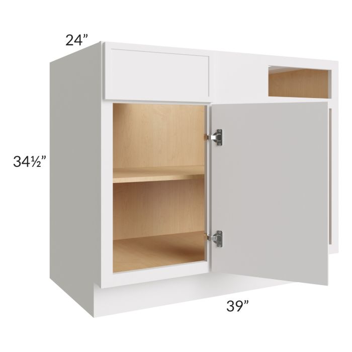 1 door blind base corner cabinet with 1 drawer and 1 shelf. The actual width is 38 1/2", but must be pulled at least 3 1/2" from the corner, taking up 42" of wall space. It can be pulled a max of 9.5", taking up 48" of wall space. The door width is 15 3/8", the stile width is 9-3/4" and the blind opening width is 12 3/4". A filler must be used between the blind and the adjacent cabinet so the doors and drawers are able to open without interference. The filler must be purchased separately.