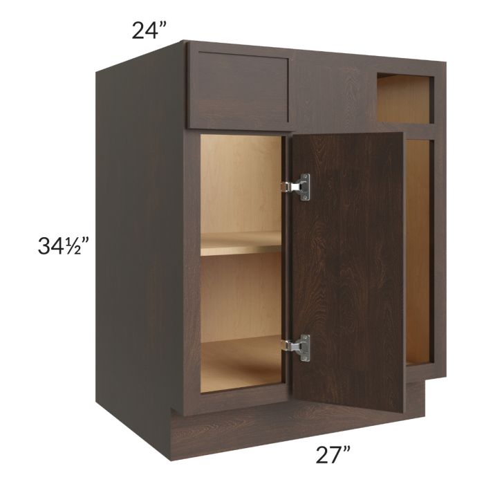 1 door blind base corner cabinet with 1 drawer and 1 shelf. The actual width is 27", but must be pulled at least 9-1/2" from the corner, taking up 36" of wall space. It can be pulled a max of 15", taking up 41-1/2" of wall space. The door width is 9-3/4", the stile width is 9-1/2" and the blind opening width is 7-1/4". A filler must be used between the blind and the adjacent cabinet so the doors and drawers are able to open without interference. The filler must be purchased separately.