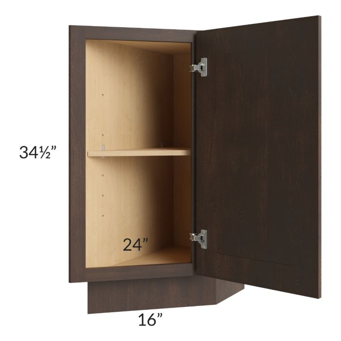 Full height door cabinet that is meant to be used at the end of a cabinet run. It will have a 24" deep side on the left which gets installed against the adjacent cabinet. The door is 16" wide and angled. The exposed side of the cabinet (on the right) will be 12" deep.