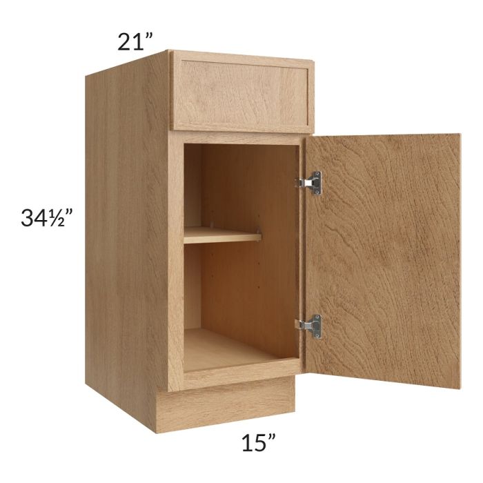 Vanity base cabinet with (1) door, (1) drawer, and (1) 15" deep shelf. There will be a 2" clearance between the drawer and back panel. The drawer front is 6-3/4" high.